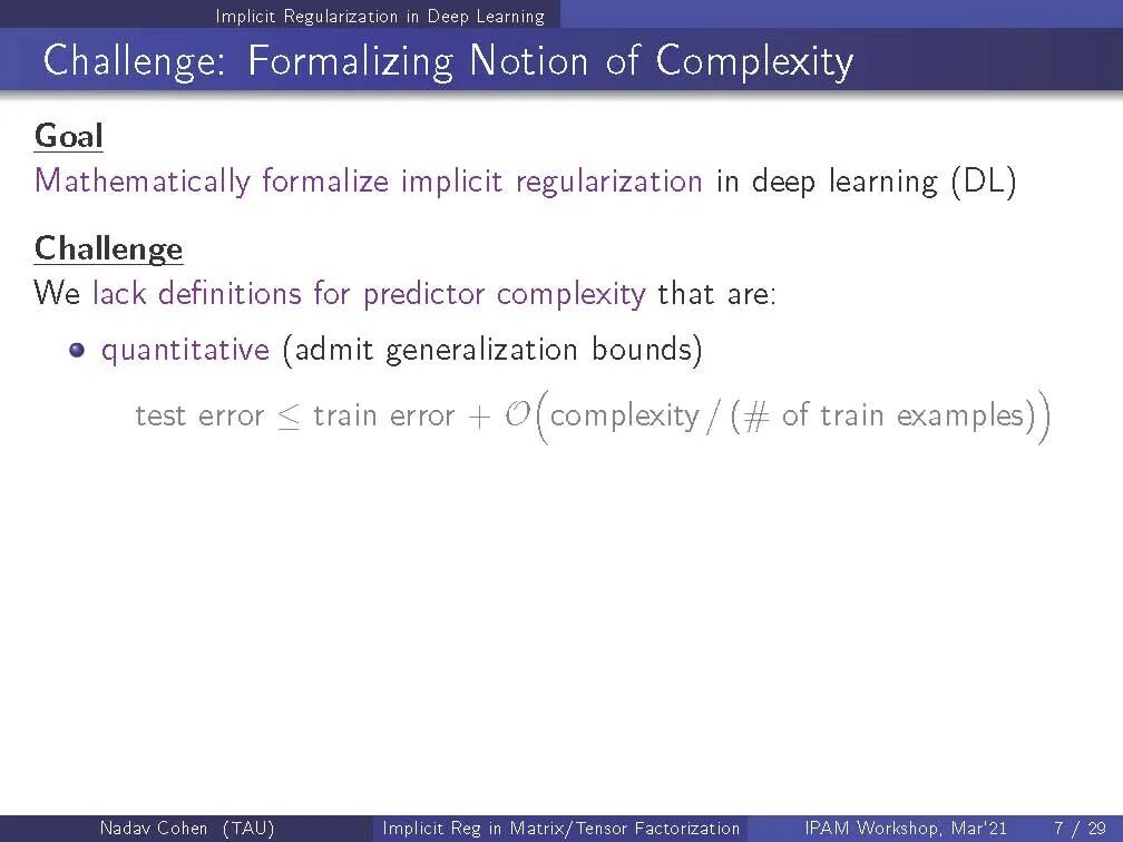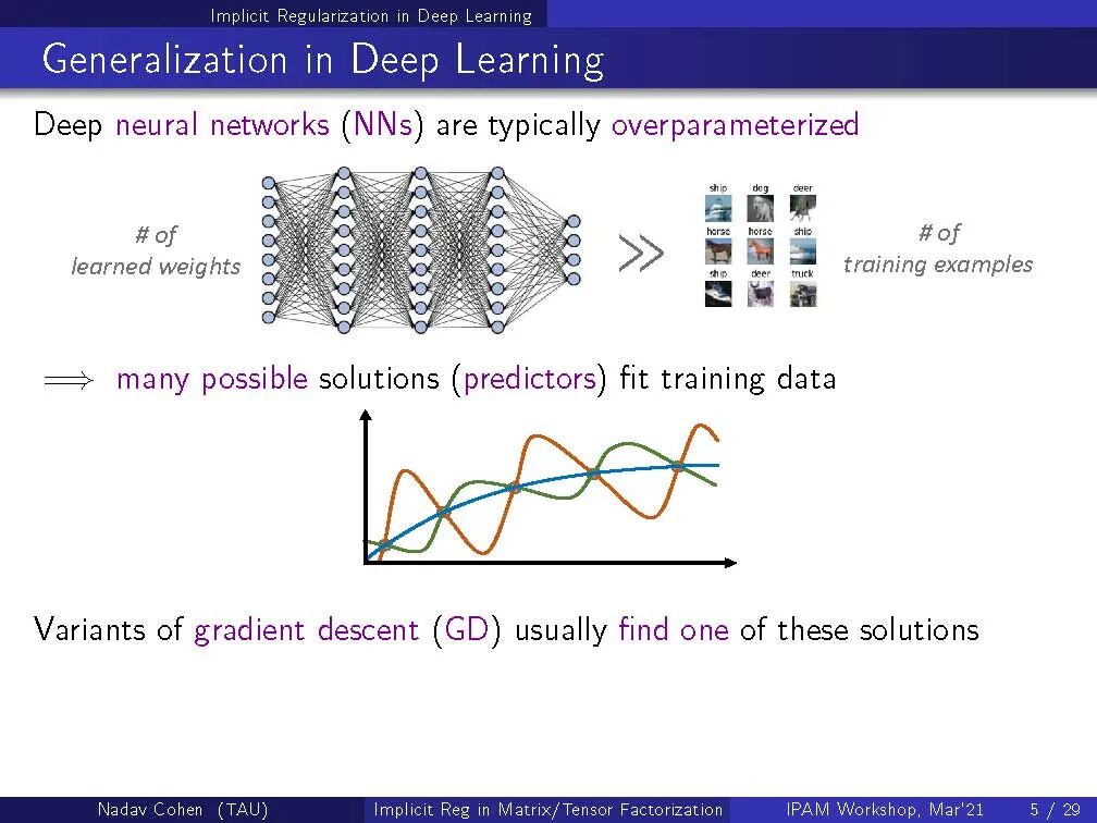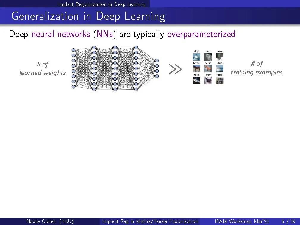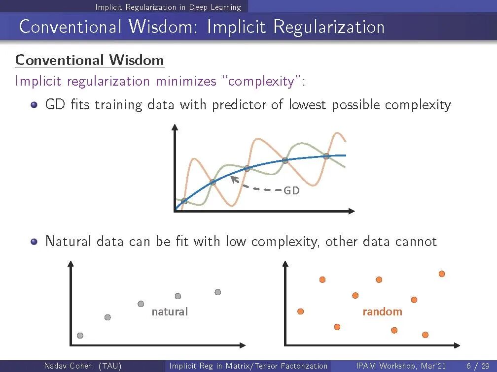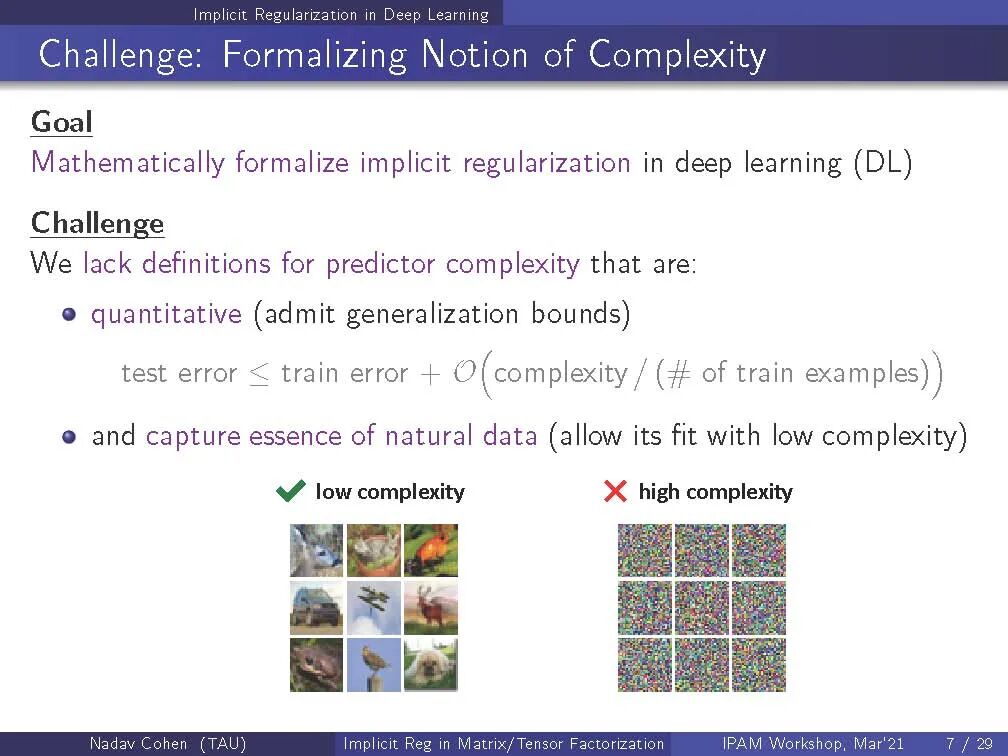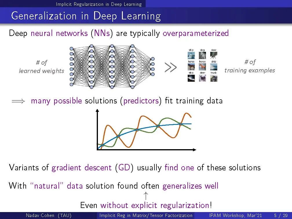 深度神经网络泛化的神秘能力被认为源于隐式正则化,一种基于梯度的优化的趋势,以拟合训练数据与低复杂度的预测器。“形式化这种直觉的一个主要挑战是,我们缺乏对复杂性的度量,既要量化,又要捕捉承认泛化的数据的本质(图像、音频、文本等)。考虑到这一挑战,我将介绍最近的隐式正则化在矩阵分解(等价于线性神经网络)和张量分解(等价于某种类型的非线性神经网络)中的分析。通过动态描述,我将建立隐式的低秩正则化,不同于任何类型的范数最小化,与先前的信念相反。然后,由于张量秩捕获非线性神经网络的隐式正则化,我将建议将其作为复杂度的度量,并表明在拟合标准数据集时它保持极低的水平。这就产生了张量秩解释神经网络的隐式正则化和将其转化为泛化的真实数据的特性的可能性。http://www.ipam.ucla.edu/abstract/?tid=16593&pcode=TMWS1