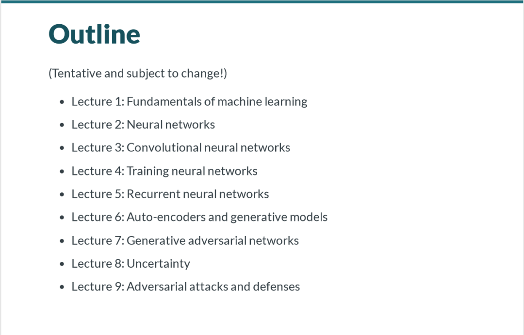 深度机器学习的最新发展使视觉识别、语音和文本理解或自主智能体系统取得了前所未有的巨大进步。在此背景下,本课程将深入探讨深度学习架构的细节,重点是学习这些任务的端到端模型。学生将学习实施、训练和调试自己的神经网络,并对该领域的前沿研究有详细的了解。该课程还将介绍推理方法的最新创新,包括微分推理、对抗性训练和贝叶斯深度学习。