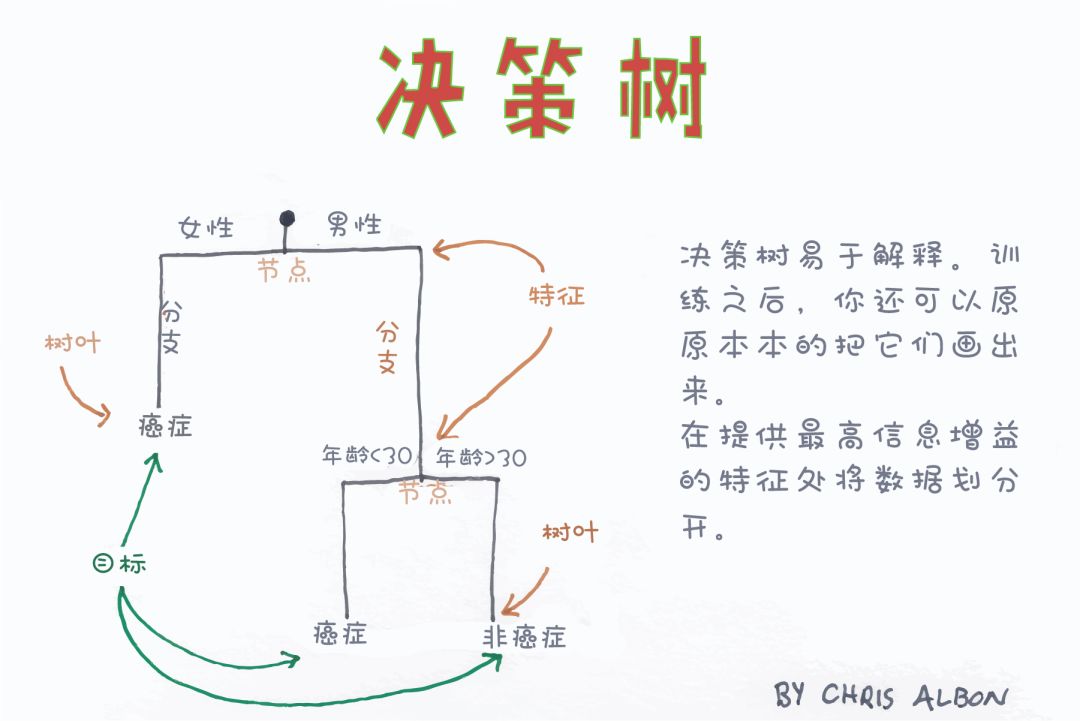 决策树以树状结构构建分类或回归模型。它通过将数据集不断拆分为更小的子集来使决策树不断生长。最终长成具有决策节点(包括根节点和内部节点)和叶节点的树。最初决策树算法它采用采用Iterative Dichotomiser 3(ID3)算法来确定分裂节点的顺序。