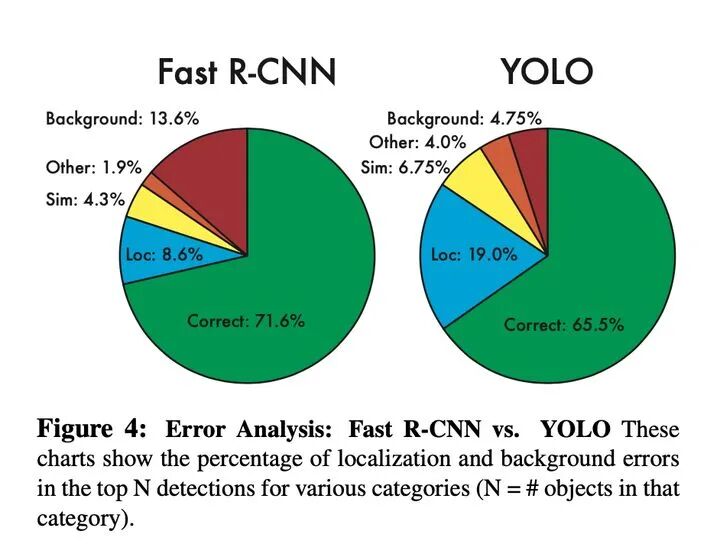 1、准确性:与Faster RCNN相比,correcct反映了YOLOv1准确率较低,background反映了召回率较高,但总体性能F1较低,虽然loss采用长宽平方根进行回归,试图降低大目标对loss的主导地位,但小目标的微小偏差对IOU的影响更严重,导致小目标定位不准