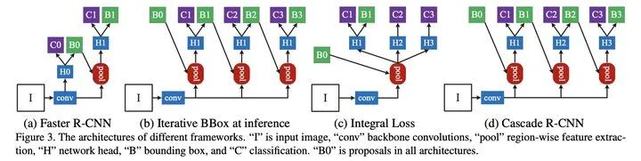 通过分析Faster RCNN在目标候选区域的位置修正能力, 如下图基于单个检测器的可优化性但优化的程度有限,通过多次将预测区域作为候选区域进行修正,使得输出的预测区域与真实标签区域的IOU逐级递增