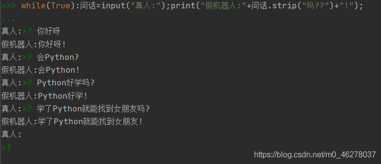 while(True): 问话=input("真人:"); print("假机器人:"+问话.strip("吗??")+"!");