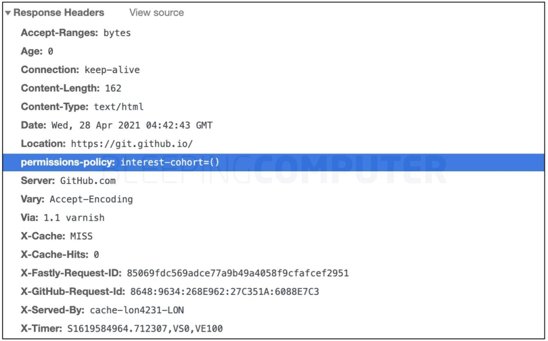 BleepingComputer还注意到整个github.com域都设置了此标头,表明GitHub在访问任何GitHub页面时不希望其访问者包含在Google FLoC的“cohorts”中。