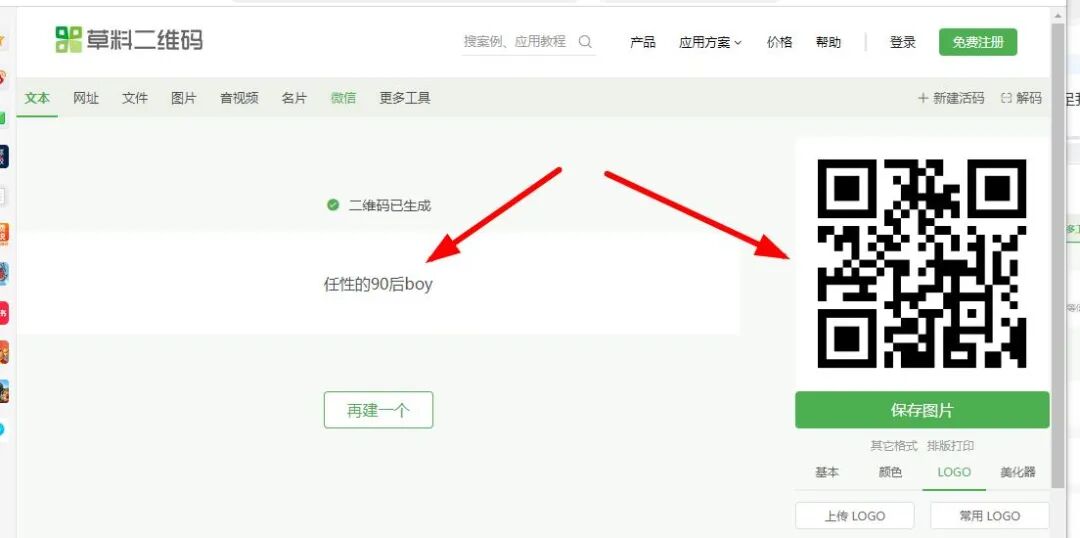 这样就完成了一个文本二维码,我们只要用扫码工具一扫就能看到 ‘任性的90后boy’ 这几个字