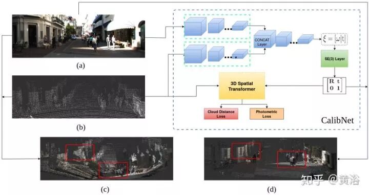 下图是CalibNet的流程图:(a)来自标定摄像头的RGB图像;(b)原始激光雷达点云作为输入,并输出最佳对齐两个输入的6-自由度刚体变换T;(c)显示错误标定设置的彩色点云输出;(d)显示使用CalibNet网络标定后的输出。