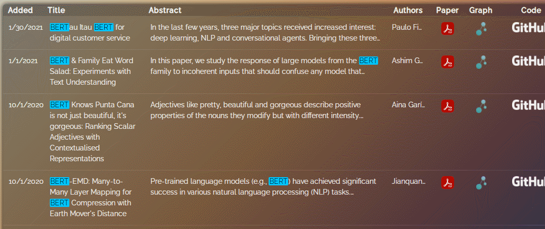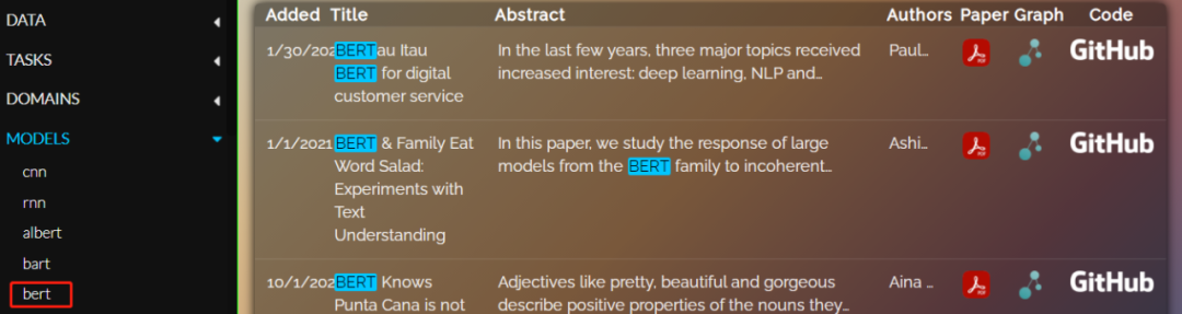 我们随机点击其中任意模型,如「bert」,右侧会显示出带有「BERT」关键字的相关论文,并以蓝色字体突出显示,除此以外还会显示论文摘要、论文作者、论文 PDF 链接、Graph 链接以及 GitHub 链接,方便使用者快速查找。