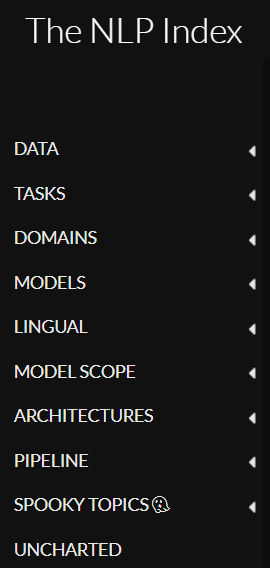 「The NLP Index」左侧栏有 10 个模块,如下图所示,包括数据(数据扩充、数据集等)、任务(关系提取、语音识别等)、相关领域(医疗、金融等)、模型(BERT、BART 等)、语言类型(跨语言、多语言等)、模型范围(字符级别、句子级别等)、包含架构(编码器、解码器等)、PIPELINE 等。