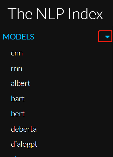 我们以左侧栏中第三个模块「MODELS(模型)」为例。点击该模块,下拉框会出现如下图所示的界面,在「MODELS(模型)」下面包含有比较常用到的模型,比如 cnn、rnn、bart、bert、gpt-2等。