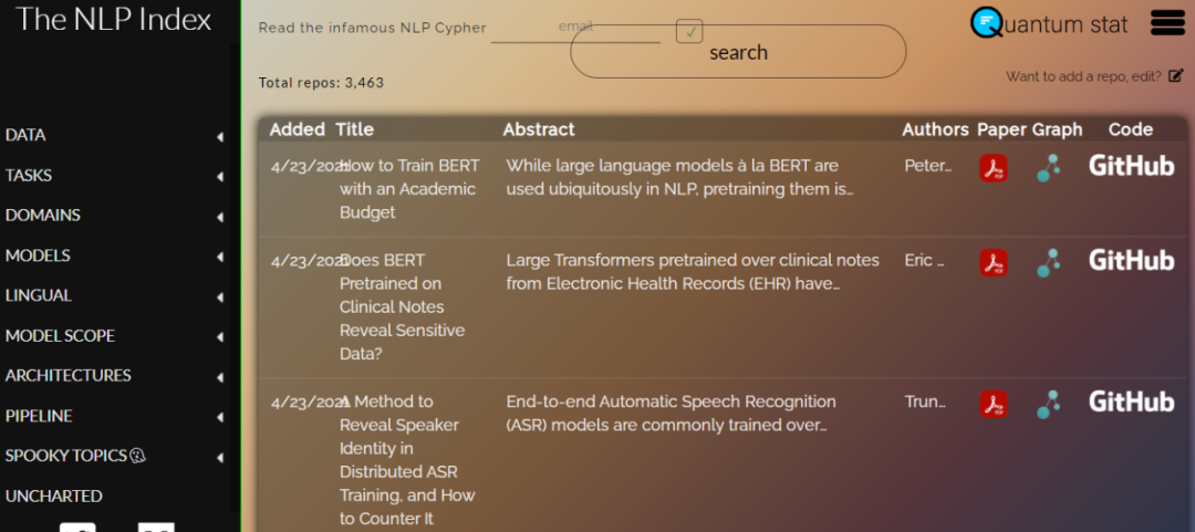 「The NLP Index」拥有 3000 多个代码库,使用者可以搜索其中一个侧栏,侧栏中包含当今 NLP 中一些最重要的主题。当你键入相关内容时,就可以进行搜索。其索引包括 arxiv 研究论文 PDF 格式、文献调研神器 ConnectedPapers 链接及其相应的 GitHub 代码库,可谓将这三款学术神器进行了综合。