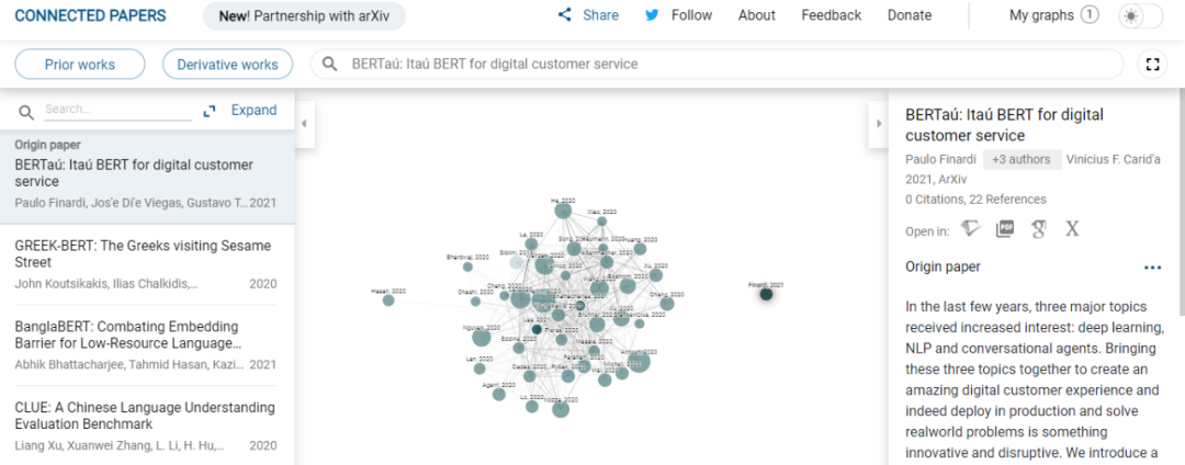 除此以外,「The NLP Index」还关联了 Connected Papers,点击 Graph 界面跳转至生成的文献分析网络图,结果页面分三栏,左边一栏是本文以及相关参考文献的题目,右边一栏是相关参考文献的具体内容,而中间一栏是文献检索分析图谱。可以在线进行分析文献的引文信息,轻松了解某篇文献的引用和被引用关联,分析出文献的前世今生,方便研究者对一篇文献或者某个领域进行调研。