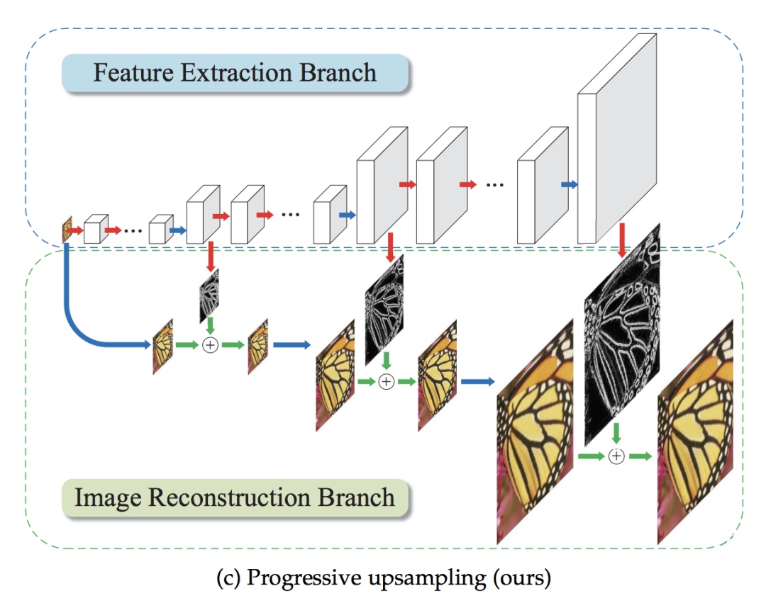 另一个是图像重建分支(Image Reconstruction Branch),它将输入图进行上采样后与相同分辨率大小的特征提取分支相加得到下一级分辨率的输出图像,直到得到最终的高分辨率结果图。