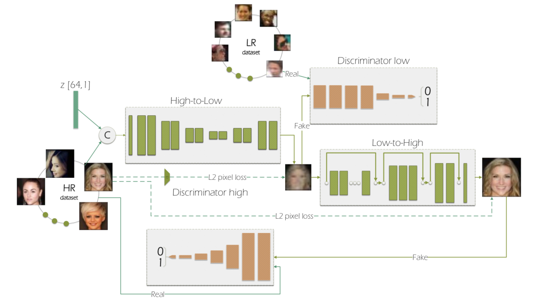如下就是一个典型框架[12],整个流程包括一个High-to-Low GAN和一个Low-to-High GAN。