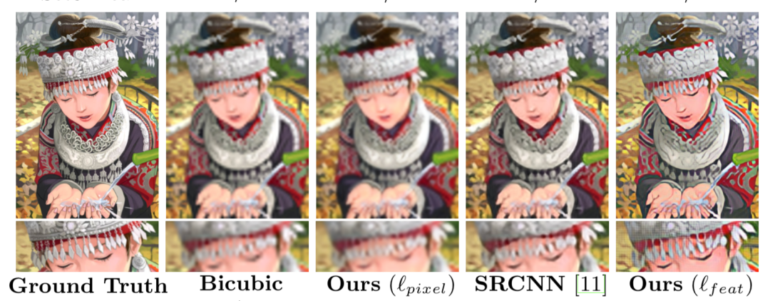 研究者[8]将SRCNN模型的像素损失改为感知损失后,显著提高了视觉效果,如下图中的最后一幅图就是使用感知损失的结果,因此感知损失也被后续的很多模型采用。