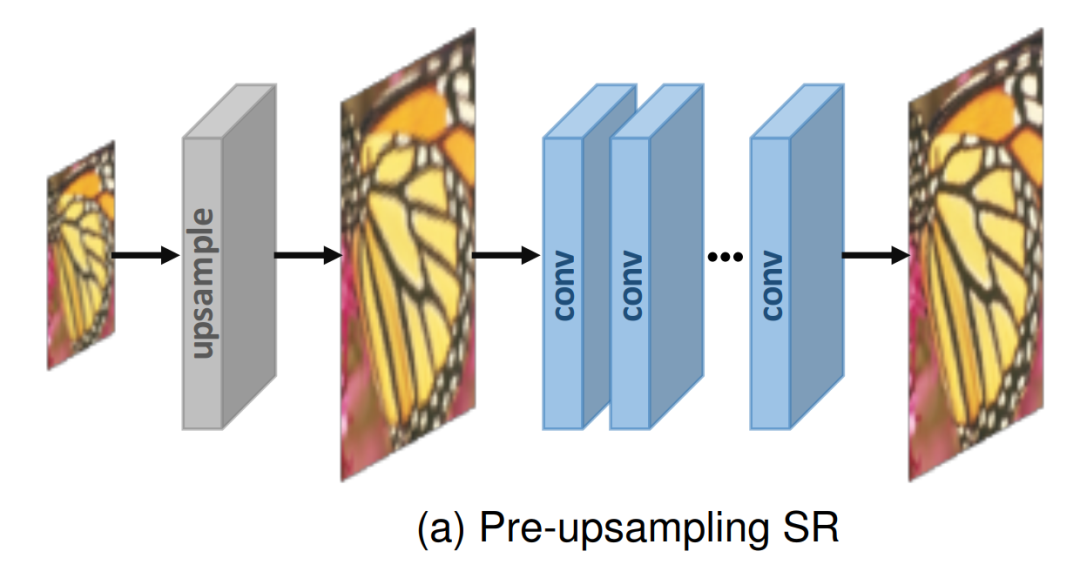 (1) 前上采样(pre-upsampling),即在网络一开始的时候就完成上采样过程。Chao Dong等人提出的SRCNN方法[2]是最早期的尝试。