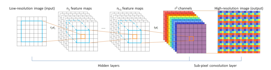 而Twitter图片与视频压缩研究组则采用了与反卷积完全不同的上采样思路,提出了ESPCN模型[4],其中核心思想是亚像素卷积(sub-pixel convolution),完整流程示意图如下: