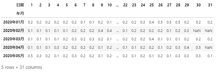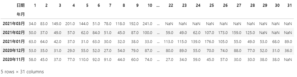 ))# 新增日期字段,内容为 1-31 df['日期' ] = df['time' ].dt.day# 做透视处理,将长表转化为宽表 data = pd.pivot(df, values='aqi' , index='年月' , columns='日期' )# 转化后部分月份不存在部分日期默认为nan值,需要转化为数字格式 float(无法转化为int) data = data.astype('float' )# 按照 索引年月倒序排序 data.sort_index(ascending=False ,inplace=True ) data.head()