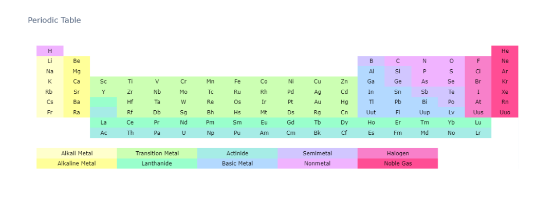 ] hover = hover[::-1 ] z = z[::-1 ]# Set Colorscale colorscale=[[0.0 , 'rgb(255,255,255)' ], [.2 , 'rgb(255, 255, 153)' ], [.4 , 'rgb(153, 255, 204)' ], [.6 , 'rgb(179, 217, 255)' ], [.8 , 'rgb(240, 179, 255)' ],[1.0 , 'rgb(255, 77, 148)' ]]# Make Annotated Heatmap fig = ff.create_annotated_heatmap(z, annotation_text=symbol, text=hover, colorscale=colorscale, font_colors=['black' ], hoverinfo='text' ) fig.update_layout(title_text='Periodic Table' ) fig.show()
