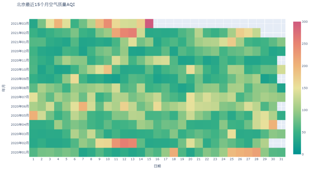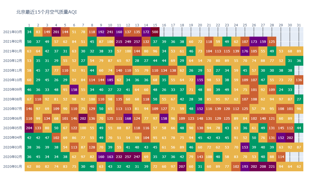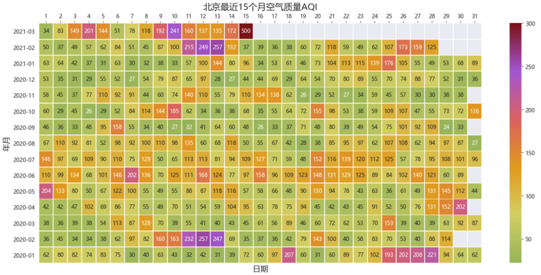 北京最近15个月空气质量热力图 上面这张热力图是用Python绘制的,今天就来讲一讲是如何做出来的。