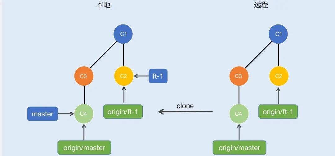 前面的章节我也有提到过,clone不仅仅是复制代码,它还会把远程仓库的引用(分支/HEAD)一并取下保存在本地,如图7所示:其中origin/master和origin/ft-1为远程仓库的分支,而远程的这些引用状态是不会实时更新到本地的,比如远程仓库origin/master分支增加了一次提交,此时本地是感知不到的,所以本地的origin/master分支依旧指向C4节点。我们可以通过fetch命令来手动更新远程仓库状态。小提示:并不是存在服务器上的才能称作是远程仓库,你也可以clone本地仓库作为远程,当然实际开发中我们不可能把本地仓库当作公有仓库,说这个只是单纯的帮助你更清晰的理解分布式。说的通俗一点,fetch命令就是一次下载操作,它会将远程新增加的节点以及引用(分支/HEAD)的状态下载到本地,具体命令如下:git fetch 远程仓库地址/分支名