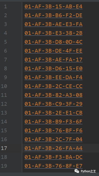 def create_mac(): MAC='01-AF-3B' hex_num =string.hexdigits #0123456789abcdefABCDEF for i in range(3): n = random.sample(hex_num,2) sn = '-' + ''.join(n).upper() MAC += sn return MAC