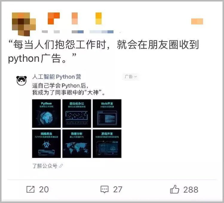 作为焦虑传播的大本营,朋友圈更是少不了python得身影,从去年开始风变编程旗下得“python训练营”得广告就成功地出现在每一个焦虑的职场人朋友圈中,挑动着你脆弱的神经。