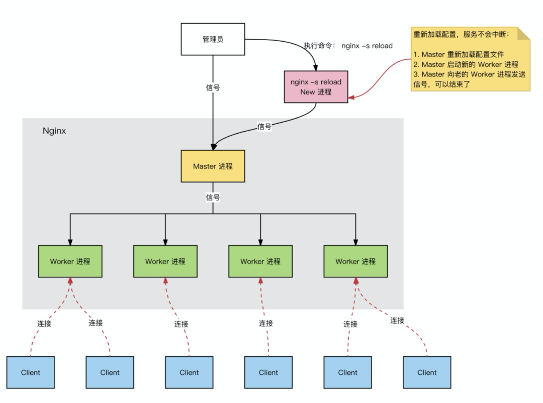 Nginx 作为反向代理服务器时,能够服务的最大连接数:(Worker 进程数量 x 单个 Worker 进程的最大连接数)/ 2。