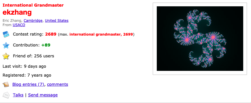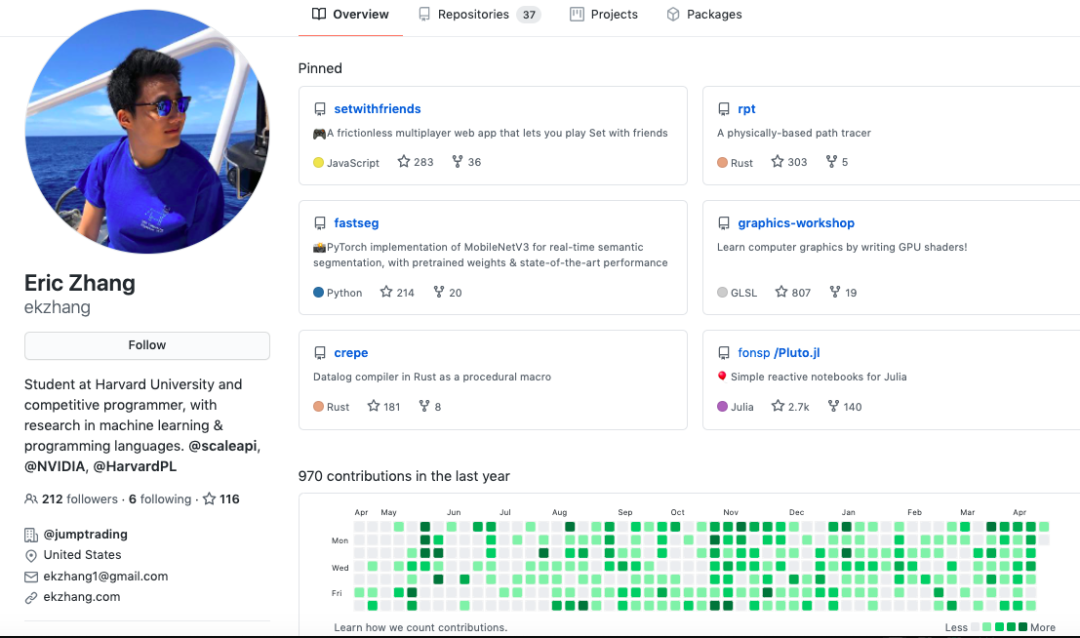 Eric Zhang,是哈佛大学的硕士研究生,学习数学和计算机科学,他的主要研究兴趣是图形学、机器学习、编程语言和系统。在高中时期代表美国拿到两块 IOI 金牌,还给美国的高中生写了一本物理书。