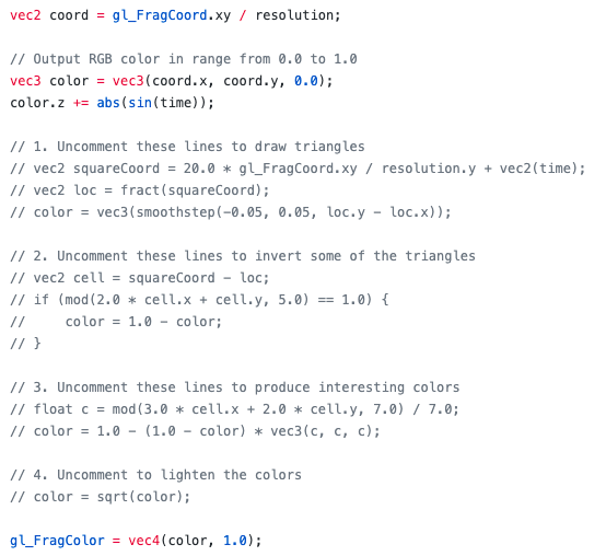 片段着色器运行在屏幕上的每个像素点,每个像素点由着色器确定它的颜色。vec4 是一个带有红色、绿色、蓝色和透明通道的 4 维向量。