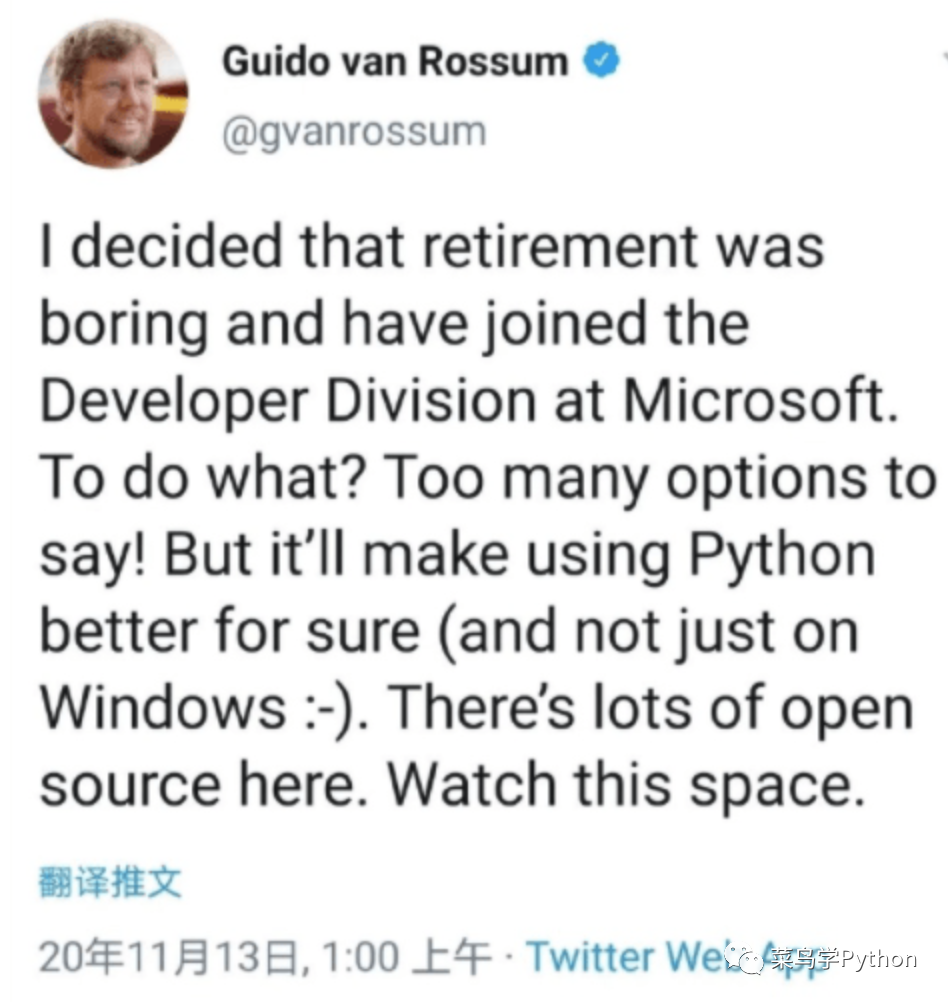 “退休的我觉得太无聊了,当我从dropbox辞职后,我想的是跟我的妻子到处旅游,和朋友聚聚会什么的,但是时间久了我意识到我需要项目,因此我又开始编程,包括Python的改进。“充满精力的龟叔永远都不愿意停下奋斗的脚步,龟叔为了重新找一份工作,便询问了一下,能够在微软兼职工作。但是当他参加了kevin scott的访谈后,龟叔意识到微软依旧想要全职雇佣他。