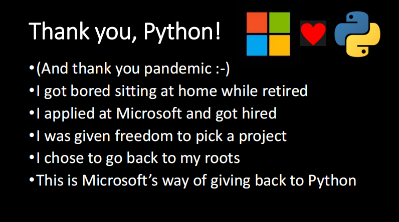 因而在峰会的演讲中,Guido van Rossum 指出:我选择回到我的根源,这也是微软回馈 Python 的方式。