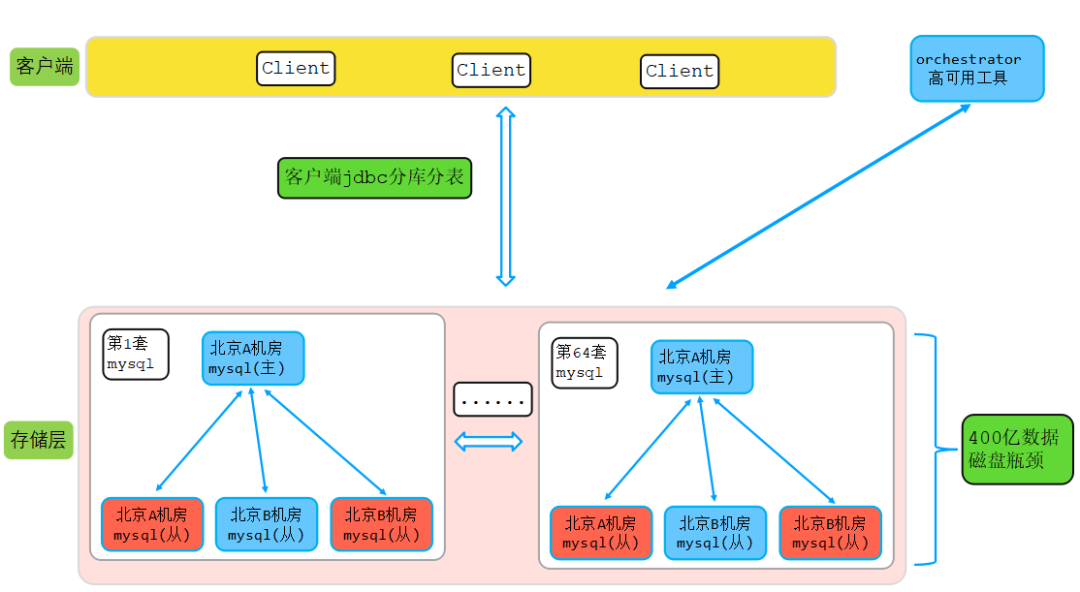 原mysql集群一共64套,每套集群4副本,每个副本容器规格:4CPU、16G mem、500G磁盘,总共可以存储400亿数据,这时候大部分节点已经开始磁盘90%水位告警,DBA对部分节点做了磁盘容量提升。