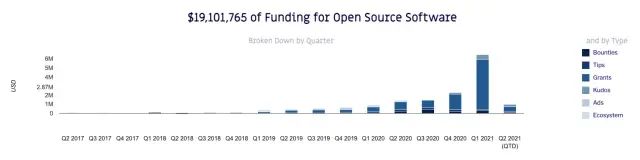 这就是我们构建Gitcoin的原因:Gitcoin是一个平台,为寻求有意义的开源工作的建设者提供资金。我们开创了二次方融资(Quadratic Funding)的先河,这是一种新颖的民主方式,可在我们的季度Gitcoin Grants计划中为公共事务提供资金。自2017年11月推出以来,Gitcoin Grants现在已为公共事务提供了近1600万美元的捐助资金。同时,还提供了354万美元的赏金,这些赏金已支付给来自世界各地的开源开发人员。