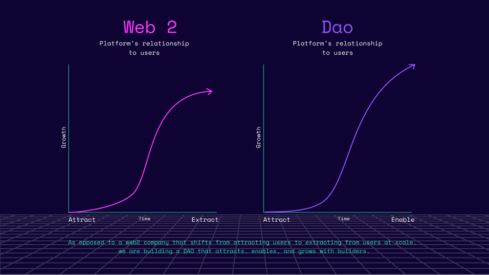 我们的最终目标是建立所谓的“二次方大陆”(Quadratic Lands),这是一个数字生态系统,在这里,数字民主统治,公共事务获得了丰厚的资金。我们希望在Quadratic Lands中重写经济重心的规则,并设想为成千上万的建设者创造向上的经济流动性。最重要的是,Quadratic Lands是由其服务的社区建造的——创造了一个积极的反馈循环,市民每天都在改善他们所居住的数字社区。