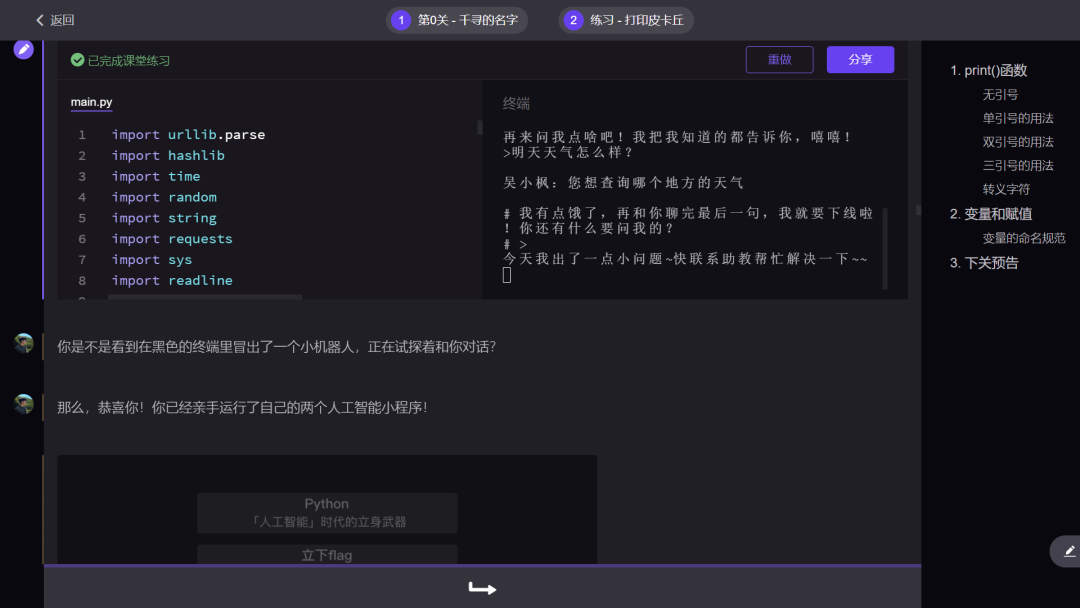 去哈尔滨玩,原价1600多的票,大神400就抢到了,省下的预算还能多吃些特色美食,旅行简直美滋滋。写个程序爬了官网上的全英雄高清皮肤海报,不仅可以自己拿来当壁纸,还卖给喜欢收藏皮肤的人,小小赚了一笔。不仅如此,还用Python爬取高分玩家的出装习惯、常用英雄,分析当前版本下的强势英雄和装备,胜率一路飙升,匹配机制都制裁不了你,这才是真正的“上分如饮水”!目前,Python人才需求增速高达174%,人才缺口高达50万,部分领域如人工智能、大数据开发, 年薪30万都招不到人!恰恰相反!Python是最简单易学的编程语言, 对小白学习者非常友好。如果你想学习Python提升下竞争力,又担心看不下去漫长的视频,更怕交了上万块学费没效果;那么,我建议你尝试一下现在最火爆的风变编程-Python小课。它改变了我对编程难学的固有认知。风变的教研团队站在普通人的视角去研发课程,符合大众的心理认知,简单有趣又好学。所以一度刷爆朋友圈,称为“网红编程课”。不同于传统的音频和视频课程,风变编程的Python课程采用游戏对话式教学。聊天一样的学习方式,你一句我一句,每按一次“Enter"键都是一次对话~Python的所有知识点,都穿插在了经典电影和动漫里面。你会体验到用代码画出一只皮卡丘、在魔法校园回复校长的来信、在汤婆婆的严防死守下帮助千寻找到名字.....曾经有学员表示:“一学起来就上瘾了,连闯3关,太有意思啦!”