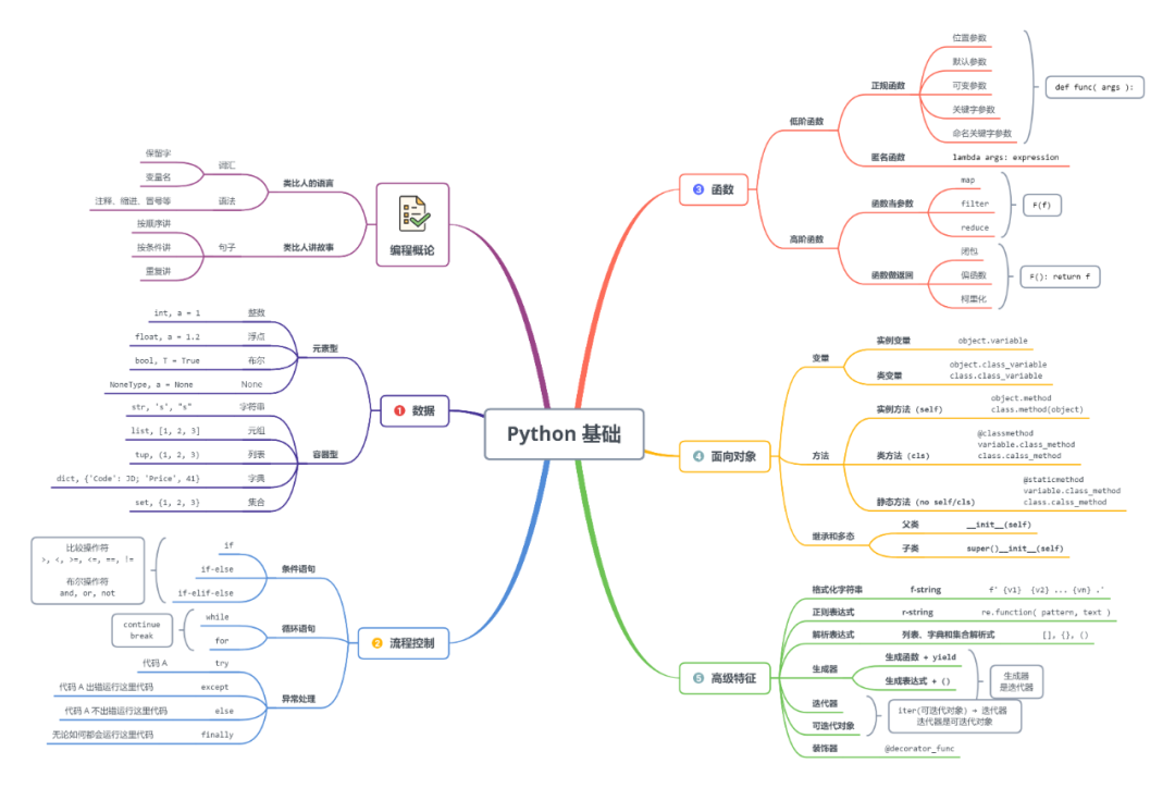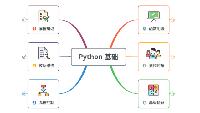 课程内容包括编程概论,数据,流程,函数,对象和类,高级特征共6大部分,如下脑图。