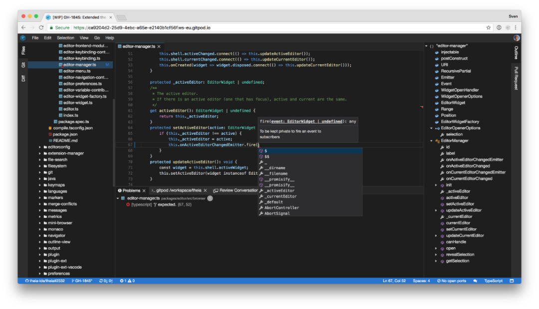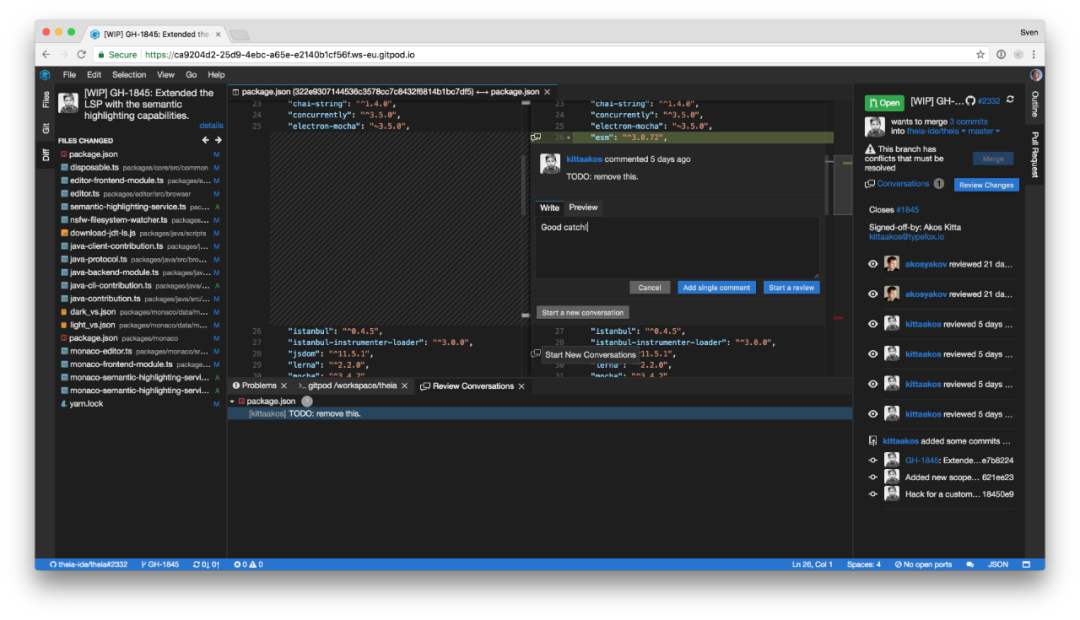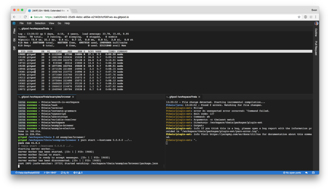 Gitpod中的IDE基于Theia,这是一个开源项目,早在2017年初我们(TypeFox)就与爱立信的朋友一起开发。您也可以将其视为VS Code的在线版本。我们喜欢VS Code,但需要一些额外的属性,比如更具可扩展性的架构以及在连接到远程后端的浏览器中运行的能力。Theia是一个真正的开源项目,由Eclipse Foundation托管,由TypeFox,Ericsson,Red Hat,Arm等的各类工程师开发。