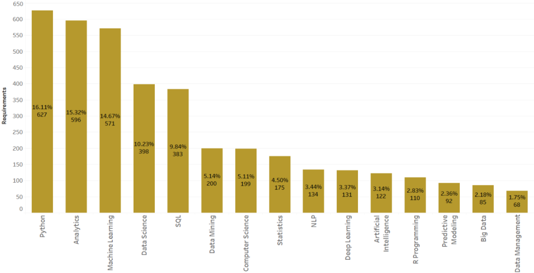 对于世界上大多数工作而言,技能至关重要,拥有正确的技能会为任何求职者带来更多的机会。如上图所示,Python 编程、分析和机器学习是最需要的三大技能。大多数人有一个错误的观念,认为 SQL 对于数据科学家是最不需要的,但它也在前五项技能之列。