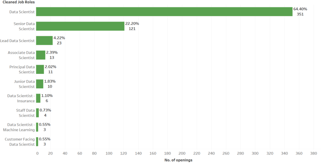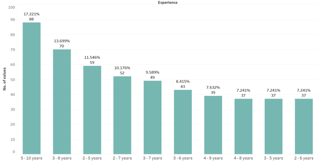 大量职位空缺面向的是 5 至 10 年的经验丰富的专业人员,高级数据科学家职位占总需求的 22%。不过,助理数据科学家职位也处于前五名。与往常一样,答案就在于数据本身。