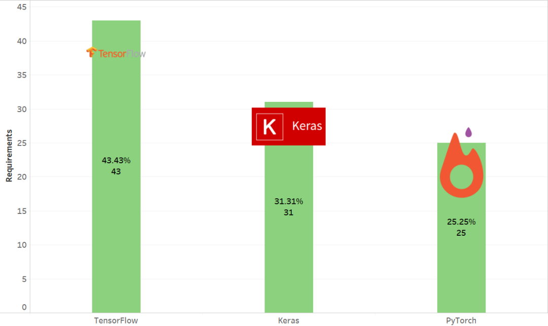 Tensorflow、Keras 和 PyTorch 是最受欢迎的框架。它们提供了一整套与深度学习技术配合使用的库,并有效地利用了 GPU 硬件的功能。谷歌的 TensorFlow 占总需求的 43%,基本是市场上需求最多的深度学习框架,其次是 Keras 和 PyTorch。
