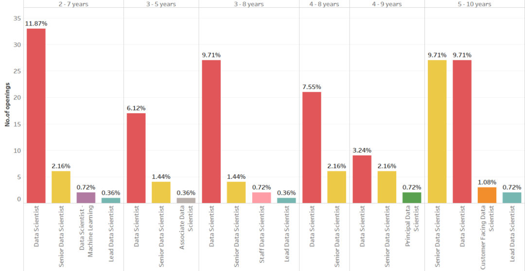 5-10 年组,数据科学家和高级数据科学家的机会是均等的;2-7 年组,高级数据科学家有 2.16%的空缺,Lead 数据科学家则有 0.36%;对助理数据科学家的要求基本在 3-5 年的经验水平范围内。