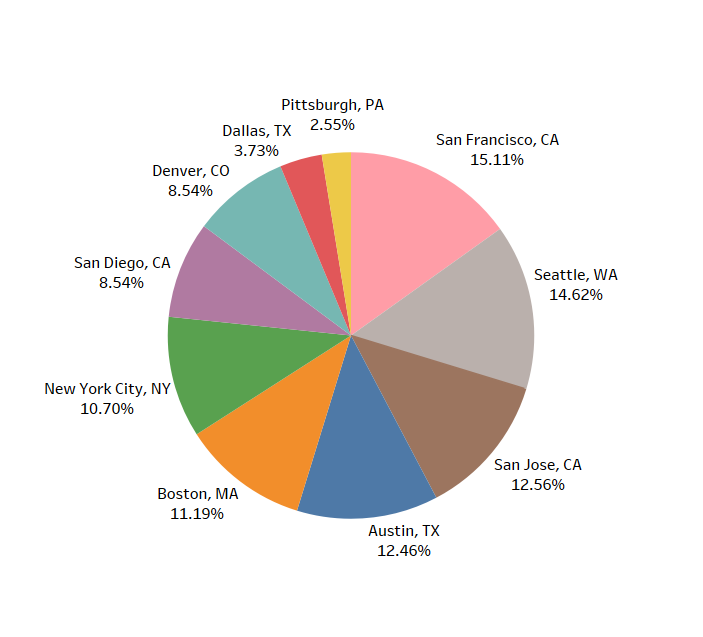 旧金山占据招聘 list 的 15%,原因不言而喻——硅谷。紧随其后的是西雅图、圣何塞、奥斯汀、波士顿、纽约、圣地亚哥、丹佛、达拉斯、匹兹堡等,其中有些意外的是工业城市匹兹堡,占据钢铁工业城市数据科学家职位 list 的 2.55%。