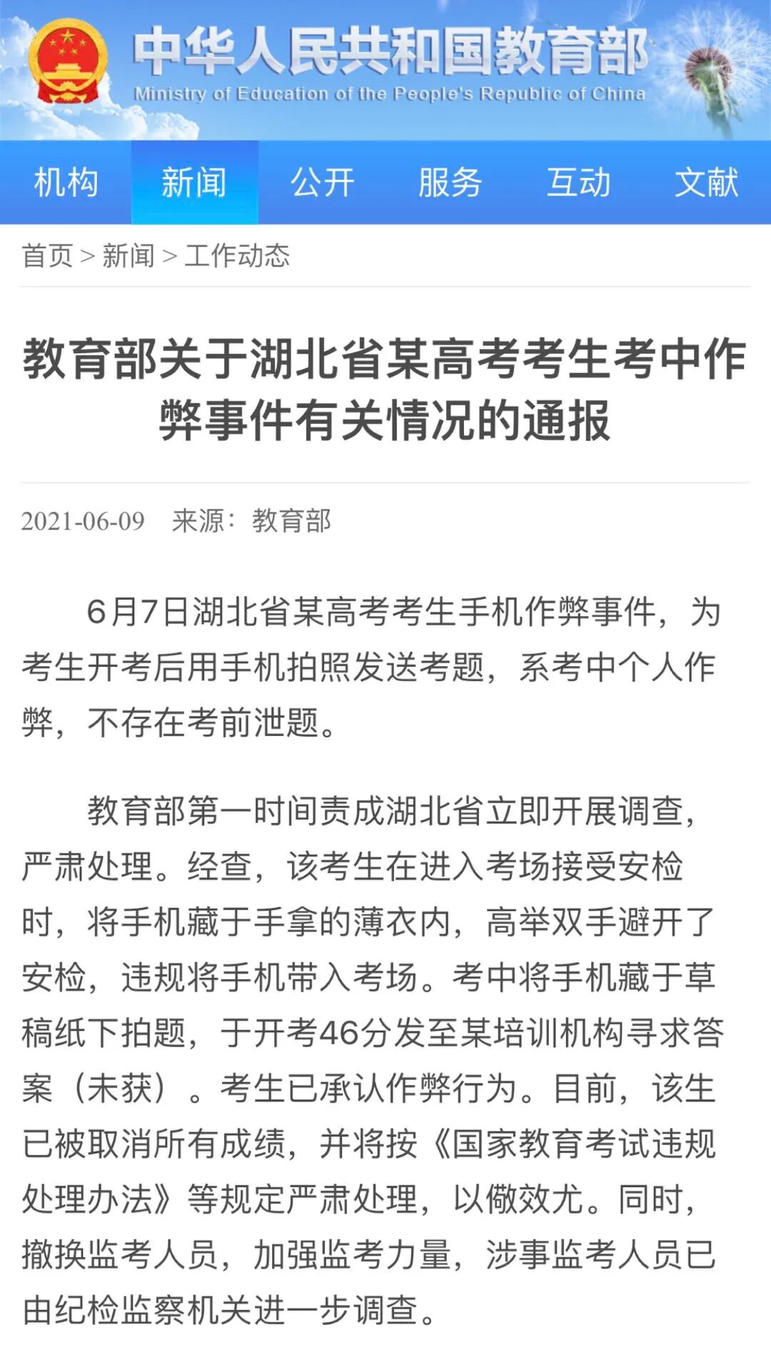 通报称,教育部第一时间责成湖北省立即开展调查,严肃处理。经查,该考生在进入考场接受安检时,将手机藏于手拿的薄衣内,高举双手避开了安检,违规将手机带入考场。考中将手机藏于草稿纸下拍题,于开考 46 分发至某培训机构寻求答案(未获)。考生已承认作弊行为。目前,该生已被取消所有成绩,并将按《国家教育考试违规处理办法》等规定严肃处理,以儆效尤。同时,撤换监考人员,加强监考力量,涉事监考人员已由纪检监察机关进一步调查。