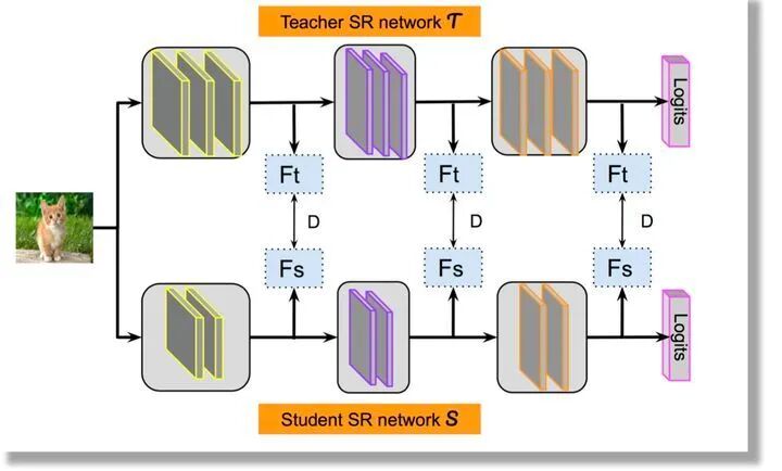 2.3 特征蒸馏 另外一种知识蒸馏思路是特征蒸馏方法,如下图所示。它不像Logits方法那样,Student只学习Teacher的Logits这种结果知识,而是学习Teacher网络结构中的中间层特征。最早采用这种模式的工作来自于论文《FITNETS:Hints for Thin Deep Nets》,它强迫Student某些中间层的网络响应,要去逼近Teacher对应的中间层的网络响应。这种情况下,Teacher中间特征层的响应,就是传递给Student的知识。在此之后,出了各种新方法,但是大致思路还是这个思路,本质是Teacher将特征级知识迁移给Student。因此,接下来我们以这篇论文为主,详细介绍特征蒸馏方法的原理。