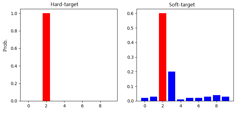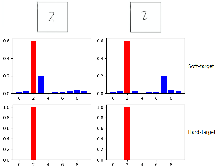 如在MNIST数据集中做手写体数字识别任务,假设某个输入的“2”更加形似"3",softmax的输出值中"3"对应的概率会比其他负标签类别高;而另一个"2"更加形似"7",则这个样本分配给"7"对应的概率会比其他负标签类别高。这两个"2"对应的Hard-target的值是相同的,但是它们的Soft-target却是不同的,由此我们可见Soft-target蕴含着比Hard-target更多的信息。