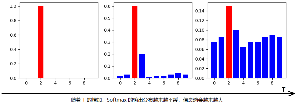 时,概率分布比原始更“平缓”。 随着 的增加,Softmax 的输出分布越来越平缓,信息熵会越来越大。温度越高,softmax上各个值的分布就越平均,思考极端情况,当 ,此时softmax的值是平均分布的。 不管温度 怎么取值,Soft-target都有忽略相对较小的 (Teacher模型在温度为T时softmax输出在第 类上的值)携带的信息的倾向。 温度的高低改变的是Student模型训练过程中对负标签的关注程度。当温度较低时,对负标签的关注,尤其是那些显著低于平均值的负标签的关注较少;而温度较高时,负标签相关的值会相对增大,Student模型会相对更多地关注到负标签。