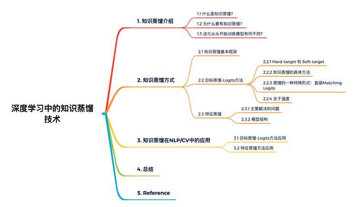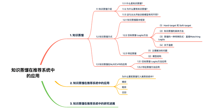 3.1 目标蒸馏-Logits方法应用 《Distilling the Knowledge in a Neural Network 》,NIPS,2014。 《Deep Mutual Learning》,CVPR,2018。 《Born Again Neural Networks》,CVPR,2018。 《Distilling Task-Specific Knowledge from BERT into Simple Neural Networks》,2019。 3.2 特征蒸馏方法应用 《FitNets: Hints for Thin Deep Nets》,ICLR,2015。 《Paying More Attention to Attention: Improving the Performance of Convolutional Neural Networks via Attention Transfer》, ICLR,2017。 《A Gift from Knowledge Distillation: Fast Optimization, Network Minimization and Transfer Learning》,CVPR,2017。 《Learning Efficient Object Detection Models》,NIPS,2017。 4. 总结 最近打算系统的学习知识蒸馏在自然语言处理、计算机视觉和推荐系统方面的理论基础及实践应用。学着学着发现相关知识太多,虽然可以跟大家分享大量的学习笔记,但是我时间有限,且不想本文篇幅太长,因此我会在下篇文章中接着给大家详细讲解知识蒸馏在推荐系统中的应用,这里先给大家放出我的学习思维导图,请大家持续关注我哈~
