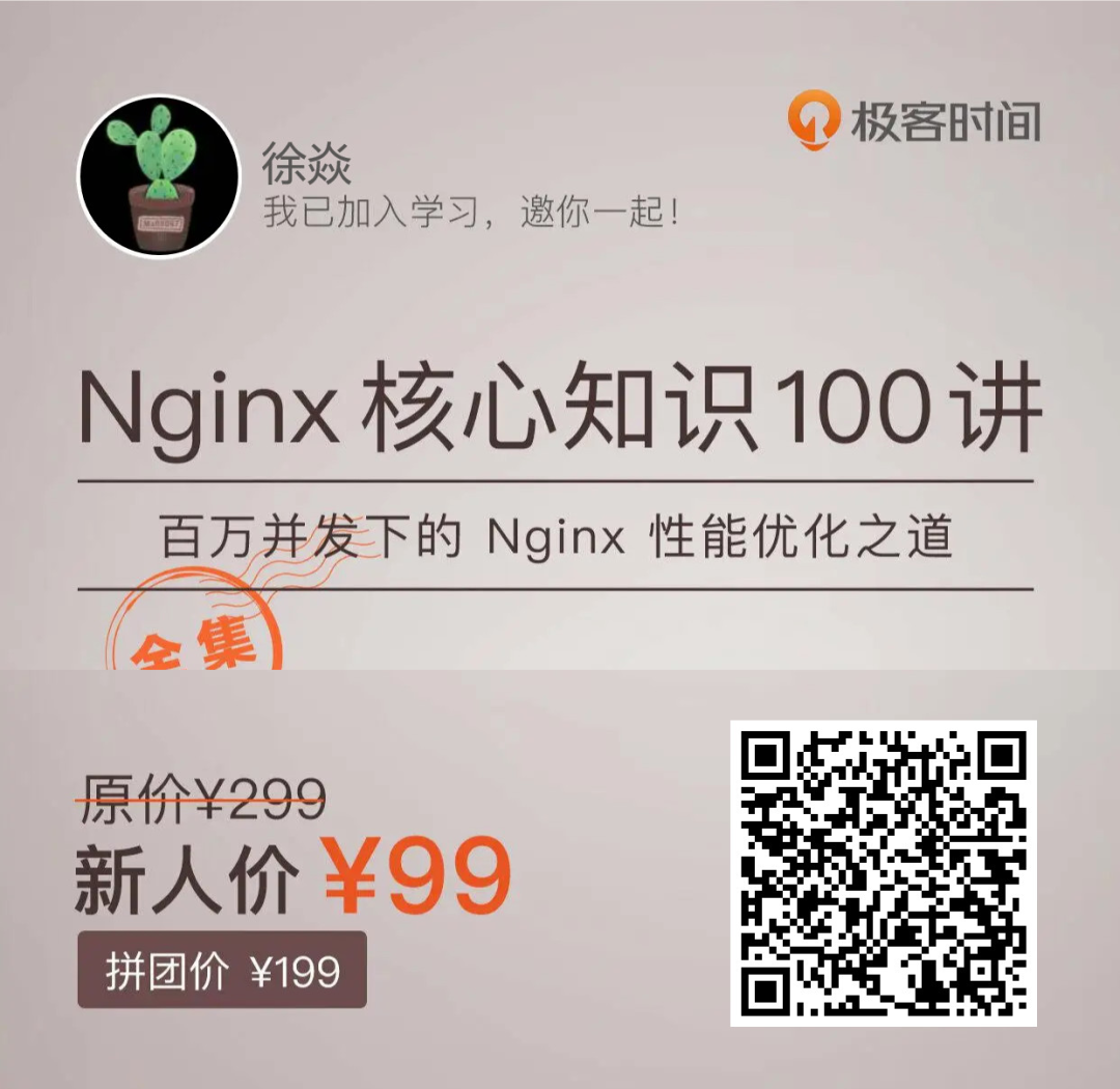 所以,那会儿得知他推出了个 Nginx 视频课,我第一时间就订阅了,基本上是追着看完的,一集不落。内容含金量非常高,陶辉老师人也很 nice,原定 100 讲内容,最后加更到 155 讲,要不是后来他换工作太忙,估计 200 讲都很有可能。