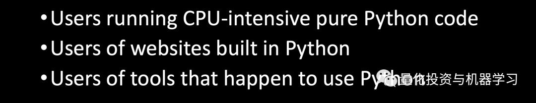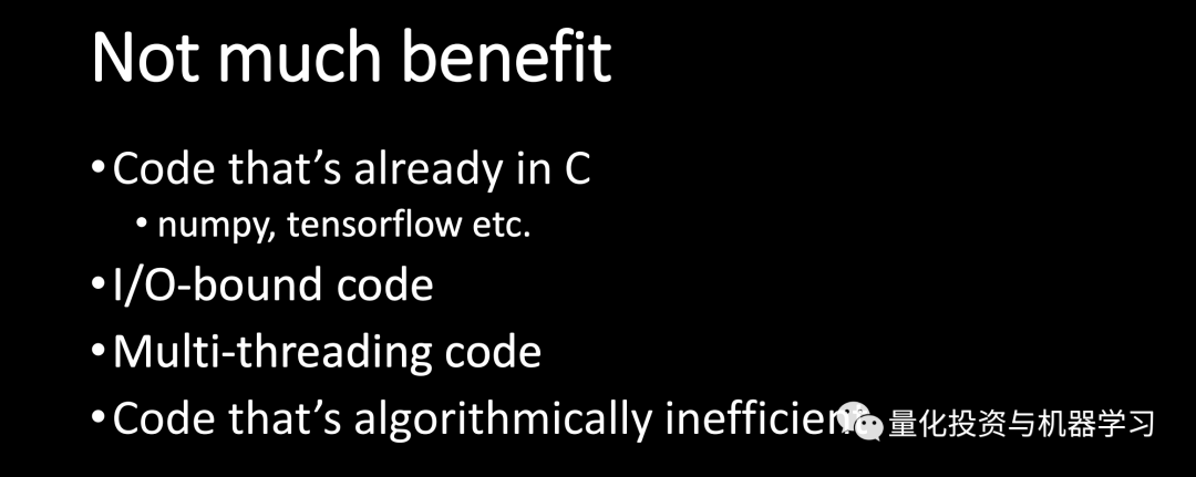 1、对于已经用 C 语言编写的代码(如 NumPy 和 TensorFlow)2、I/O-bound 代码3、多线程代码4、及算法效率低下的代码
