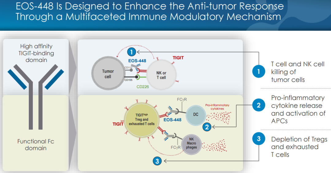 EOS-448是一款高TIGIT亲和力和高选择性IgG1抗体,包含一个Fc结构域,能够结合Fc𝛾R效应细胞。具有多种作用机制:1)抑制TIGIT与其配体CD155结合。2)与FcγR结合,触发促炎细胞因子释放,活化抗原提呈细胞,消耗TIGIT+ treg和耗竭T细胞(exhausted T cells)。