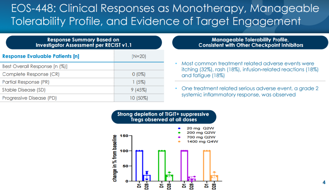 2021年AACR会议公布的I期临床数据显示,EOS-448耐受性良好并表现出早期临床活性迹象,20例疗效